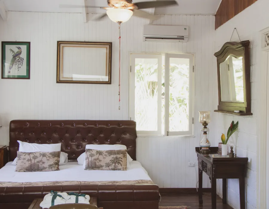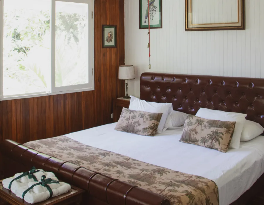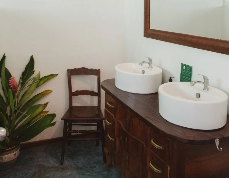 Enjoy a 5-star hot shower under the chandeliers. Double washbasins and European style bidet. The best feature of the room is… waking up and seeing the jungle through the scenery large window.